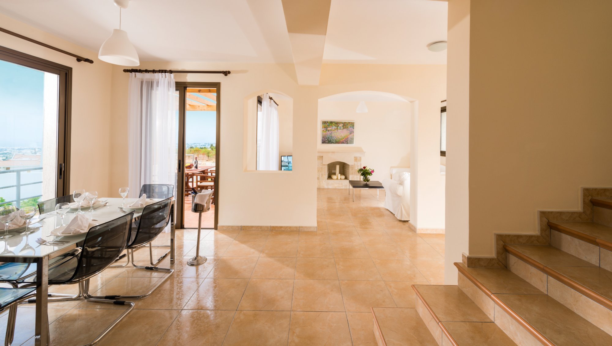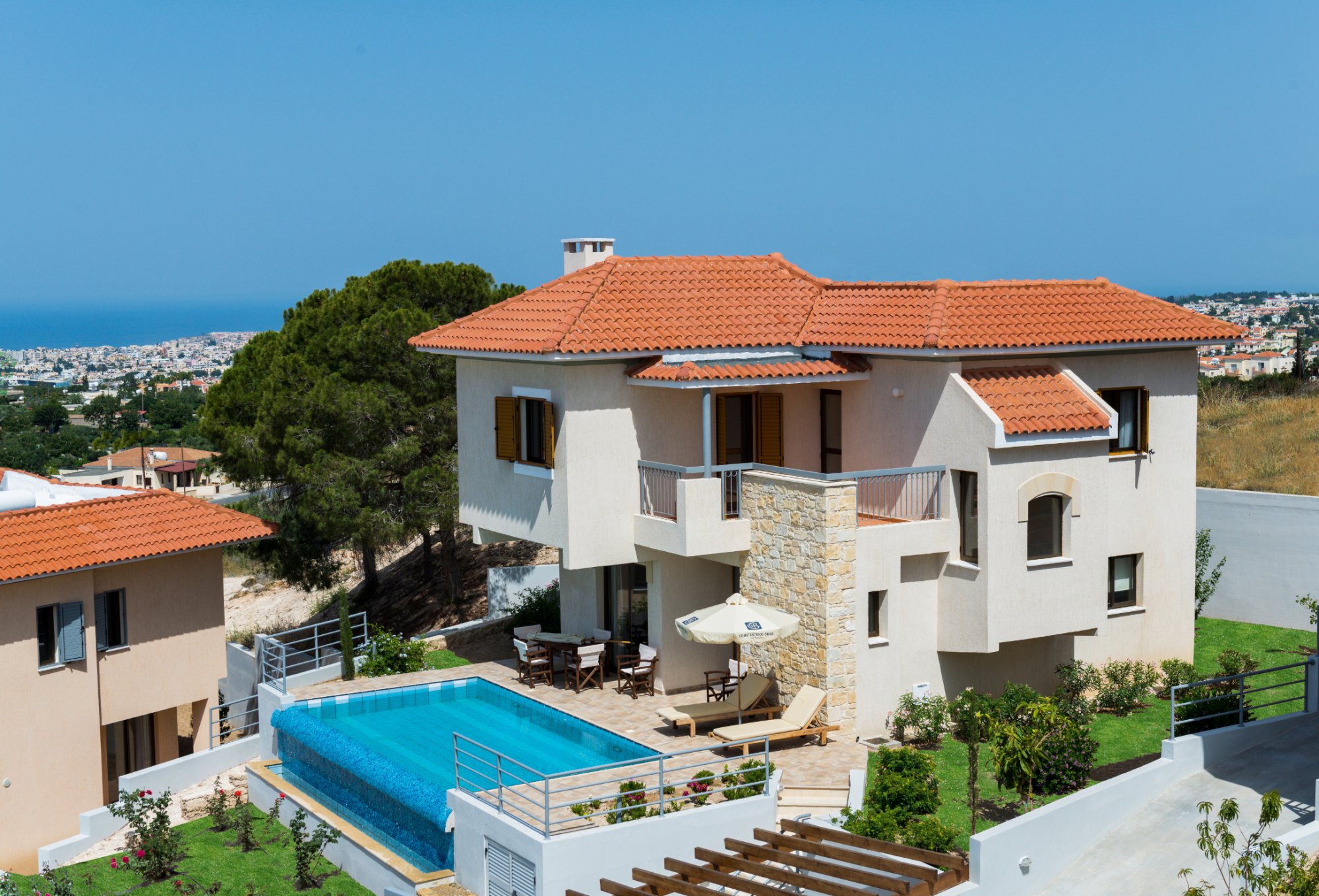 Among many of the luxury amenities offered at Konia Hills include spacious tiled balconies and verandas, and landscaped private gardens, for outdoor relaxation or entertaining. This is complemented by private parking for added convenience, and the option for a private swimming pool, to cool down and unwind. Inside, the properties feature ceramic floors, a charming stonework fireplace, shutters on bedroom windows, and double-glazed windows. The open-plan modern kitchen is equipped with granite countertops, and the master bedroom comes with en-suite facilities, ensuring a sophisticated and comfortable living environment. Residents can also enjoy top-tier security with measures like a secure front gate and a dedicated guard.